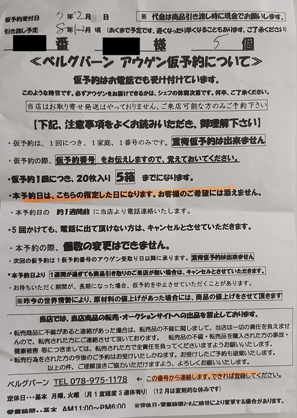 スミレが予約した際、予約後に個数を減らすことができると案内されましたが、今回アウゲンを受け取りに行った際には、現在は予約後の個数変更はできないと案内されました。予約用紙にも「個数変更不可」と明記されています。
