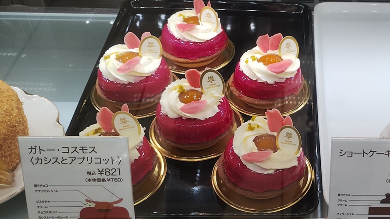 ガトー・コスモスは、カシスとアプリコットを使ったケーキで、いちごとは違った酸味のある大人っぽい味わいが楽しめそうな印象。ショーケースの中でも、少し落ち着いた雰囲気があり、目を引いていました。