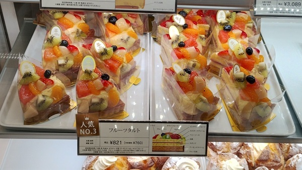 2025年12月撮影したフルーツタルト。色とりどりのフルーツが並び、ショーケースの中でもひときわ華やかでした。