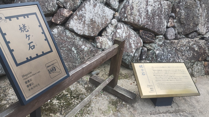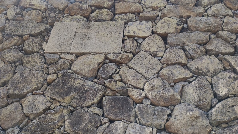 その石臼は、石垣の間を埋める間詰め石として使われています。石垣の上の方には、欠けた石臼が積まれているとも書かれていました。