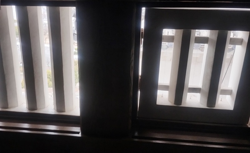 開け閉めできる窓と、枠だけの窓。開け閉めできる窓は、修理のために、外に出られるように作られていたこと。