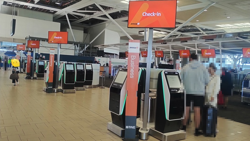 一方、ブリスベン空港では、ビジネスクラス専用の自動チェックイン機はあるものの、荷物預けは一般レーンに並ぶ必要がありました。