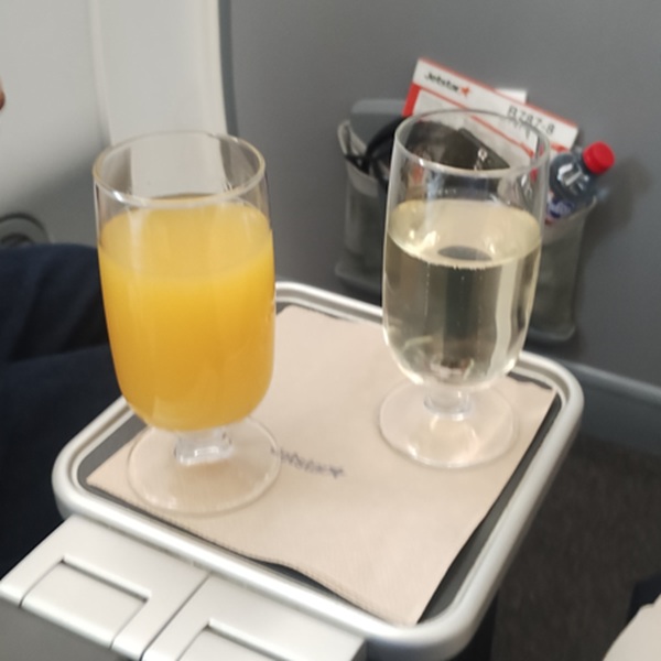 ▲ スミレは、スパークリングワイン。復路では、レモンはオレンジジュースを頼みました。