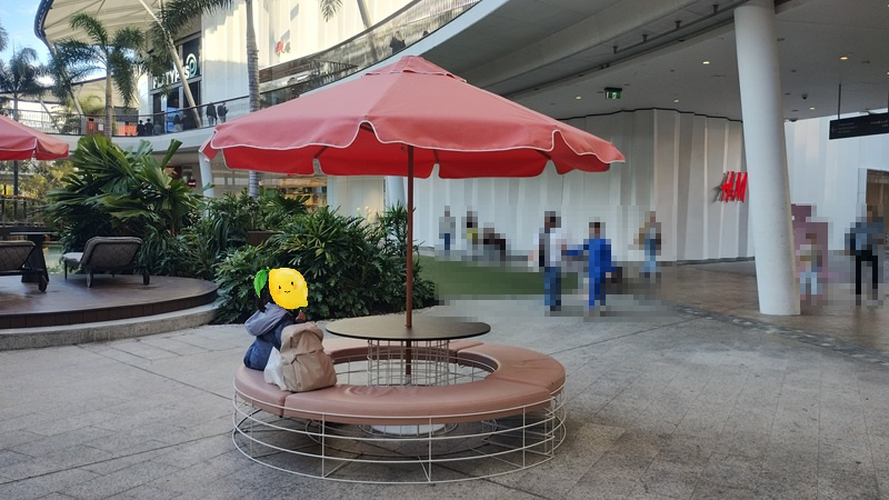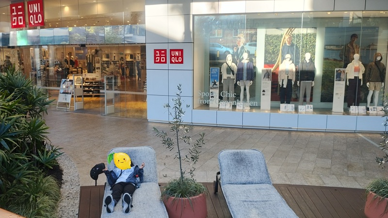 ユニクロの前にはベンチがあり、丸いテーブルに椅子がぐるっとついているベンチでは、買い物の合間に親子で座ってひと休みすることができました。