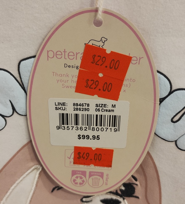 下のうさぎのパジャマの値札です。定価99.95ドルが49.00ドルになり、さらに29.00ドルに割引されています。