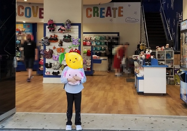 そのぬいぐるみを抱いて、レモンがお店の前で写真を撮りました。