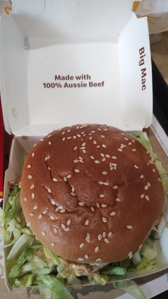 ビッグマックの箱を開けると、「100% AUSSIE BEEF」の文字。